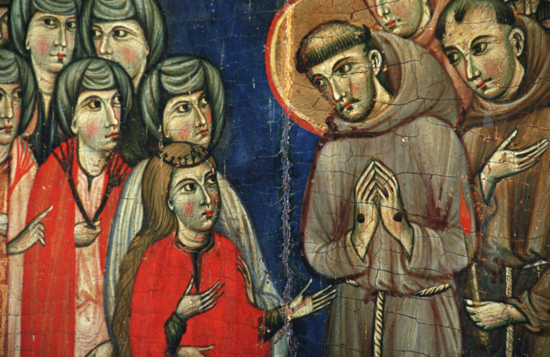 La pianta a croce latina della Basilica di Santa Chiara ad Assisi (Perugia, Umbria del Nord) presenta un'unica navata costituita da quattro campate che terminano in un transetto e un'abside poligonale. A differenza della Basilica di San Francesco le pareti di questo edificio sono spoglie di ogni affresco: tale semplicità era stata predisposta per accogliere un ciclo di affreschi sulla vita della Santa rimossi nel 1700 per ordine del vescovo. Quei pochi frammenti che erano rimasti andarono poi distrutti nel terremoto del 1832.