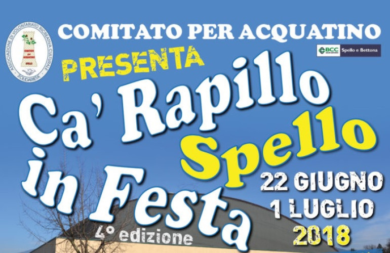 La sala polivalente di Ca' Rapillo, poco fuori il centro storico, funzionerà allora da contenitore nei giorni della festa, dal 22 giugno sino al primo di luglio 2018. quando sul palco si esibirà Vanessa Angeloni per il concerto di chiusura. È che, edizione dopo edizione, siamo arrivati alla quarta, Ca' Rapillo in Festa 2018 - Sagra dell'Oca Arrosto e del Tarfufo si è ampliata perché il successo è costante ed ora è diventata una manifestazione di riferimento per la zona con un atteggiamento davvero inclusivo, che gli organizzatori, il Comitato per Acquatino, sanno sfruttare per un sano divertimento. D'altra parte il successo non ha mai distratto dal continuare sulla strada intrapresa tenendo ben vivo l'oggetto della costituzione "Associazione di volontariato ricreativa culturale e solidarietà". E a Cà Rapillo questo sentimento si sente. Pure molto forte.
